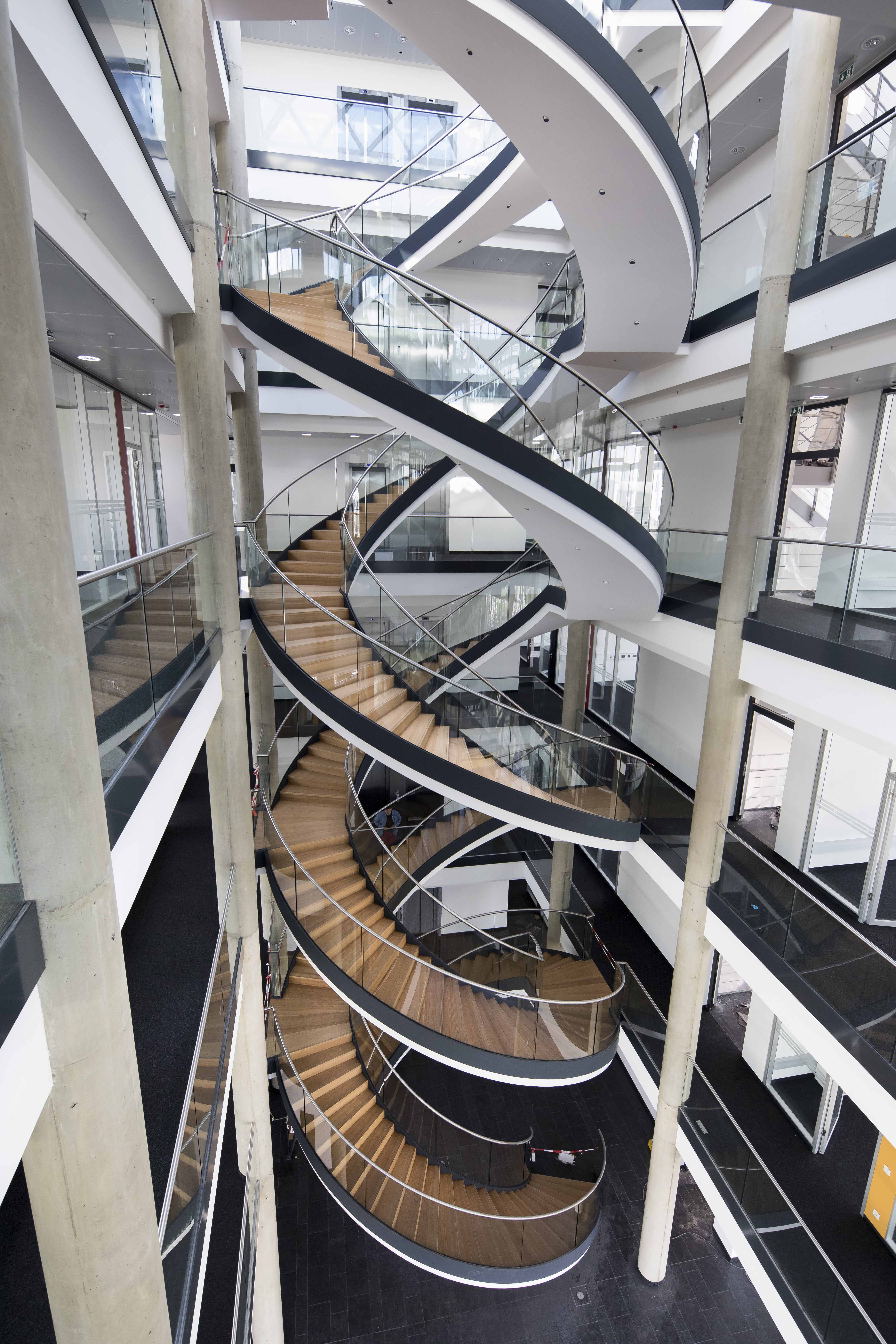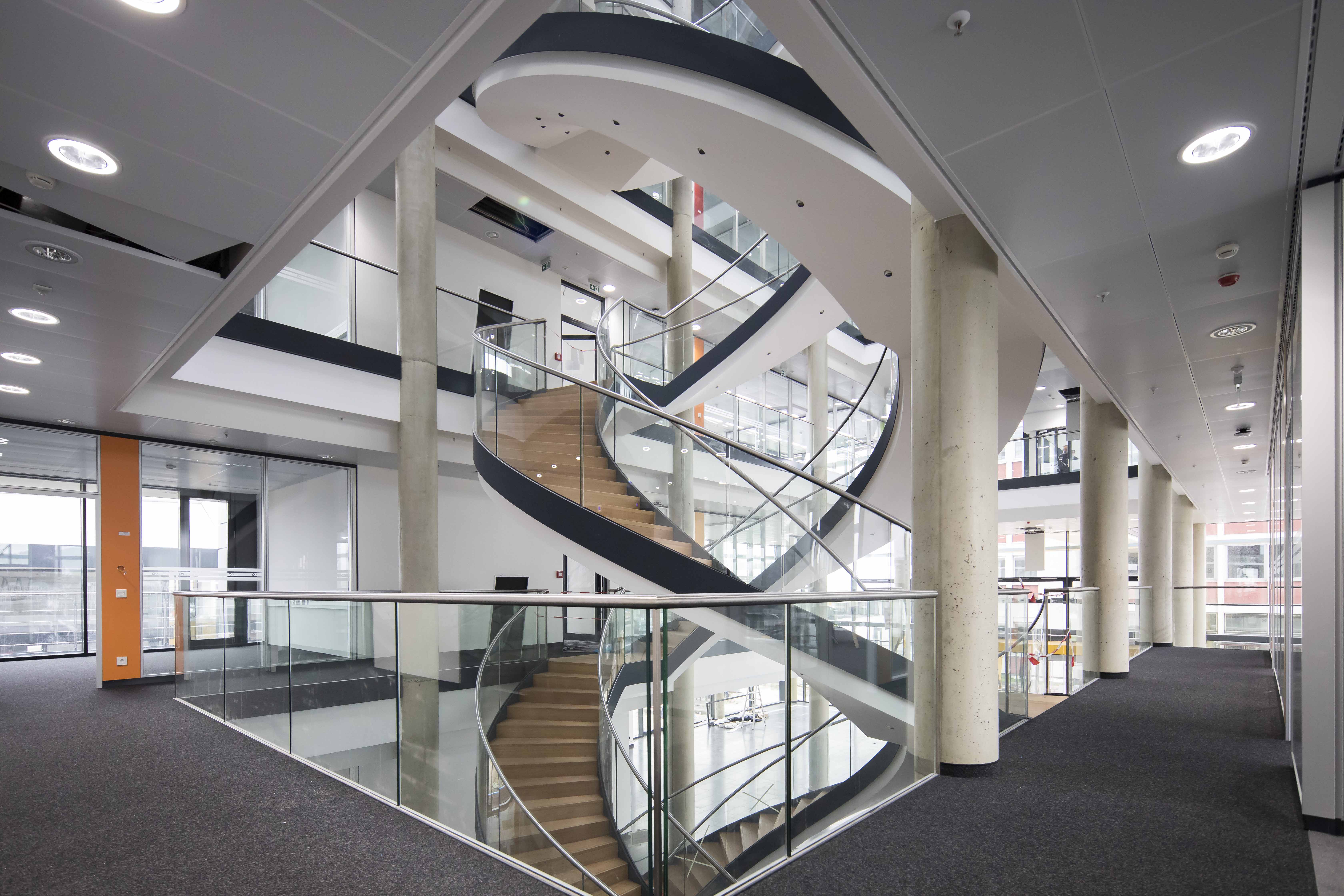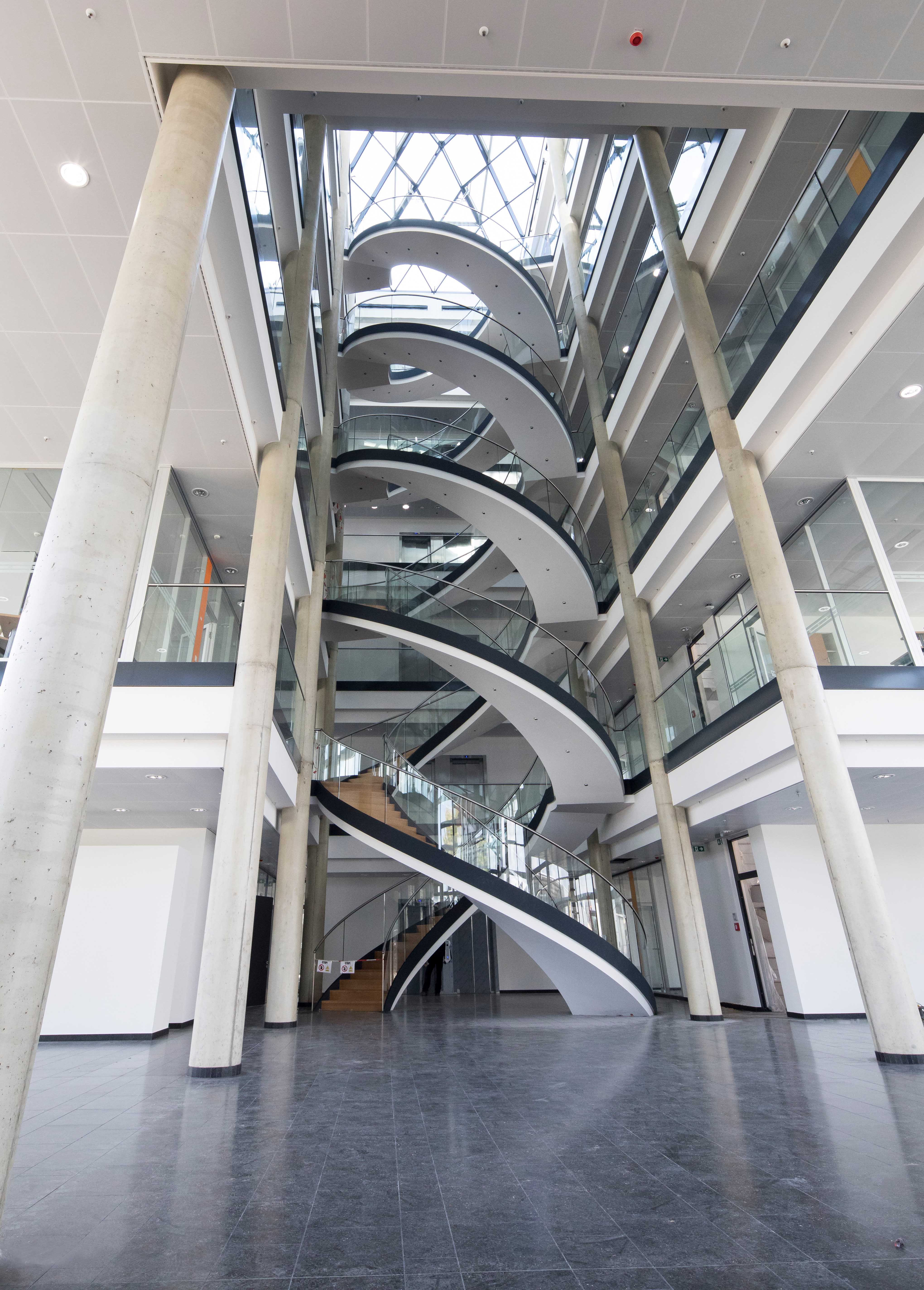 A double-spiral staircase connecting all six storeys stands out as a special architectural highlight. The staircase design is based on the Sigma Profile of the rotary screw rotors that play such an important role in Kaeser’s success as a company. Rotary screw rotors are essentially two interconnected spirals; they are the very heart of a rotary screw compressor and are the components that actually compress the ambient air to produce compressed air. Kaeser first developed a highly energy-efficient version of these rotors in the 1970s and continues to refine this technology today. As Thomas Kaeser explains, “Continued innovation is essential. After all, the future belongs to those who push the boundaries of development ever further to chart new territory and who are open to new ideas and concepts. Kaeser’s future will be just as successful as its present and past.”